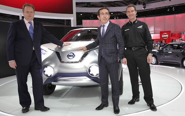 Nissan Terra FCEV Concept has revealed details about a Paris Motor Show concept that combines the style of a Juke, the running gear from the Leaf and Pivo, and seats at least partially inspired by the McLaren F1. It's called the Terra, a fuel-cell-powered crossover. Nissan is previewing the Terra before its Paris Motor Show reveal later this month, suggesting that it represents the next generation of Nissan fuel cell vehicles. The car, which is about 1-2 inches larger than the current Nissan Juke in every exterior dimension, is powered by a hydrogen fuel cell stack, which generates electricity for a driveline essentially ripped straight from the battery-electric Nissan Leaf. But to give the Terra off-road (or all-weather) chops, Nissan installed an in-wheel motor in each of the rear wheels, making the Terra an all-wheel-drive vehicle. As with all in-wheel motor setups, giving the Terra torque vectoring - like what's offered in the all-wheel drive Juke -- is as simple as sending a little more electricityto an outside wheel motor in a corner.